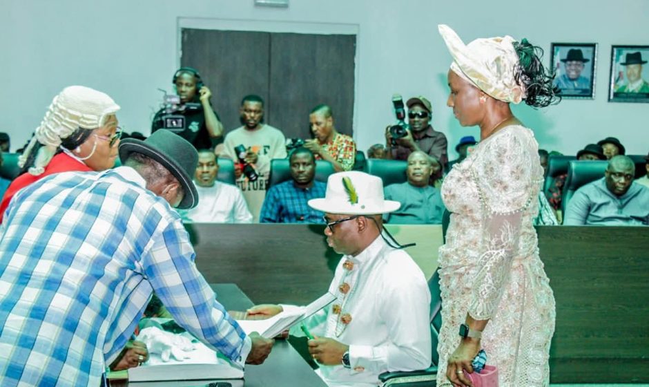 The swearing-in ceremony was held at the Executive Council Chambers of Government House, Yenagoa.