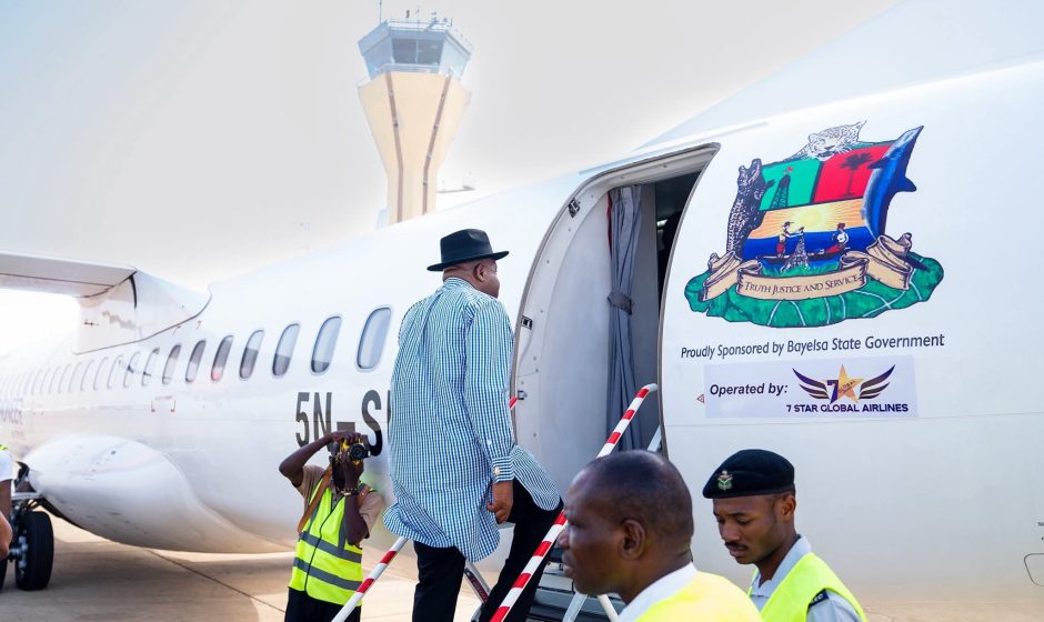 The plane departed from the domestic wing of Nnamdi Azikiwe International Airport, Abuja, at 09:30hrs with about 50 passengers, including the governor, Deputy Governor Rear Admiral Gboribiogha John-Jonah, members of the Bayelsa National Assembly Caucus, the Minister of State for Petroleum, Senator Heineken Lokpobiri, Managing Director/CEO of the Niger Delta Development Commission, Dr. Sam Ogbuku, and other dignitaries. It landed at 10:40hrs, greeted by jubilant crowds and a water cannon salute from airport fire trucks.