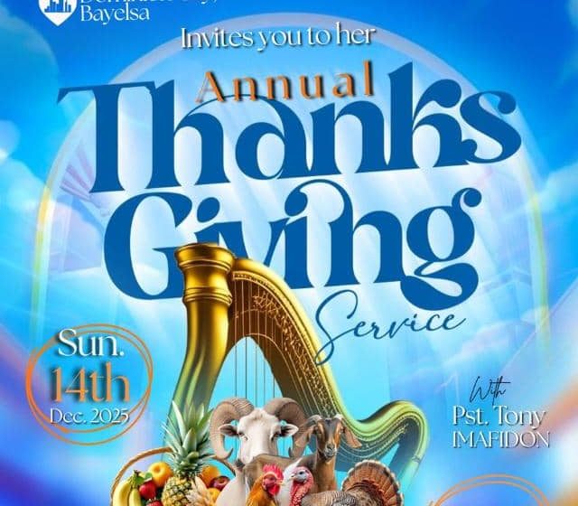 In his sermon, the Senior Pastor of Dominion City Bayelsa, Pastor Tony Imafidon, described thanksgiving as a joyful response to the mercy and goodness of God over one’s life. He explained that it is a grateful reaction to God’s activeness in the lives of believers and an act that generates trust in God, which guarantees His continual release of blessings. Reading from several scriptures including Psalms 50, 22:3, 68:3–4, 107:22, 69:30; 1 Chronicles 16:28–36; Hosea 14:1–3; Hebrews 13:15; Matthew 6:21; and Proverbs 3:9–10, the cleric emphasized that true appreciation must be accompanied by giving, noting that thanksgiving should end with one’s treasure.